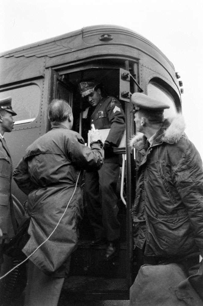 Here, LIFE.com presents a series of photos—most of which never ran in LIFE magazine—showing Elvis, along with his 15-year-old girlfriend, Priscilla Beaulieu, in Germany on the day he left to return to the States (March 2, 1960), and Elvis again at Fort Dix, New Jersey, where he landed on March 3, sans Priscilla. He was officially discharged from the Army on March 5. These pictures, by LIFE photographers James Whitmore and Al Fenn, capture a moment in Elvis’s life when he was poised to remind everyone who may have doubted it that, despite two years of taking orders, he was ready to again be the King.