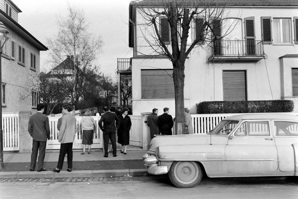 Elvis Presley fans congregated at the house in which Elvis and his family lived, shortly after he left the house for the last time, Bad Nauheim, Germany, March 1960.