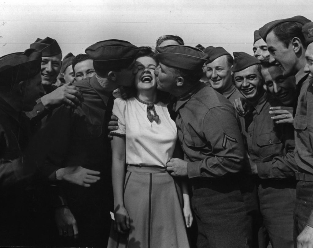 First she passed down the aisle giving each grinning trooper a taste of her pretty lips. Since other soldiers had duties elsewhere in camp, she wandered from barracks to soup kitchens to sentry posts. There was no shortage of Marilyn’s war commodity, nor were there priorities or second rations. She left each soldier well-bussed and bemused. At day’s end her kissometer recorded 733 smacks. The effect on morale was terrific. As they staggered back to their chores, Marilyn’s be-lipsticked beneficiaries mumbled dreamily: “We won’t wash our faces for a month.”