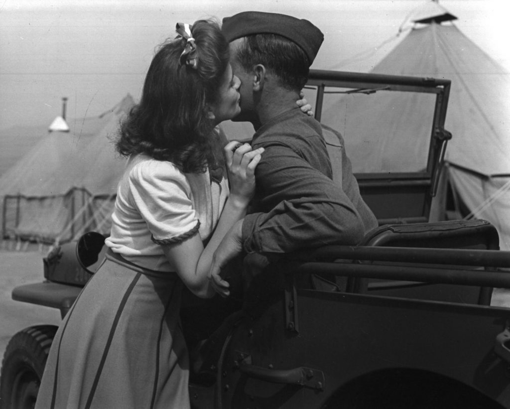 At an Army encampment near a southern California aircraft factory last month, perky movie starlet Marilyn Hare embarked on one of the most formidable morale-building projects yet contrived for the U.S. Army. A good fighting machine, she knew, thrives on joie de vivre. From her father, the late Ernie Hare of the famed pioneering radio team call the Happiness Boys, 18-year-old Marilyn had learned the art of evoking merriment in others. But in this hour of national crisis, Miss Hare had evolved a unique inspiration program of her won. It was her aspiration to kiss 10,000 soldiers.