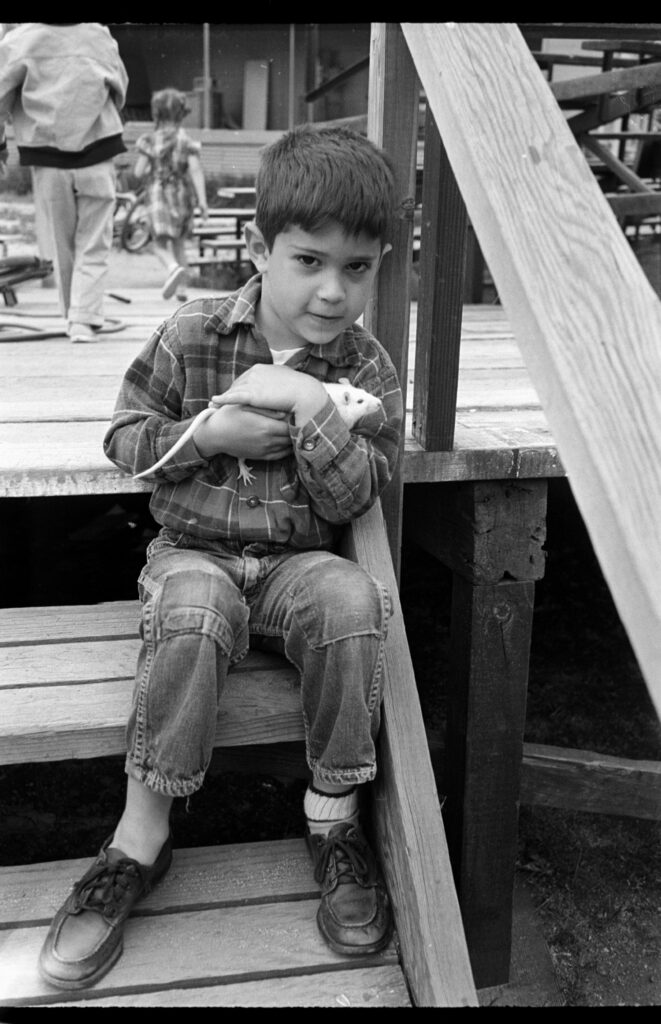 A youngster with the white rat he borrowed from the animal lending library in Sacramento, California, 1952.