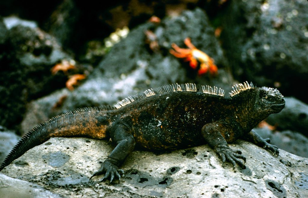 Original caption: “Lava lizard dines on a smaller member of his tribe, an unusual meal since lizards normally eat insects. Most abundant of local reptiles, lava lizards are found everywhere on the islands, including the homes of men. When angry they blow themselves up with air and spit their displeasure.”
