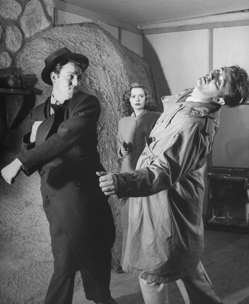 Actress Jane Greer (C) performing in scene from the 1947 movie Out of the Past with actors Steve Brodie (left) and Robert Mitchum.