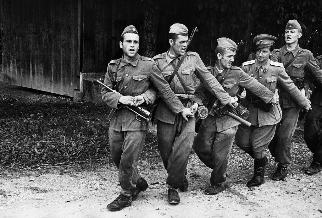 Yugoslavian infantrymen and an officer dancing the conga-like Kolo while singing. (Photo by John Phillips/The LIFE Picture Collection © Meredith Corporation)