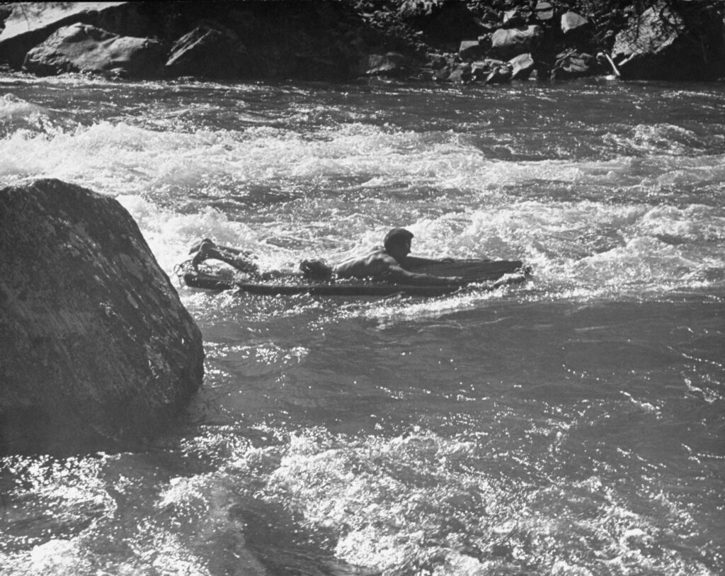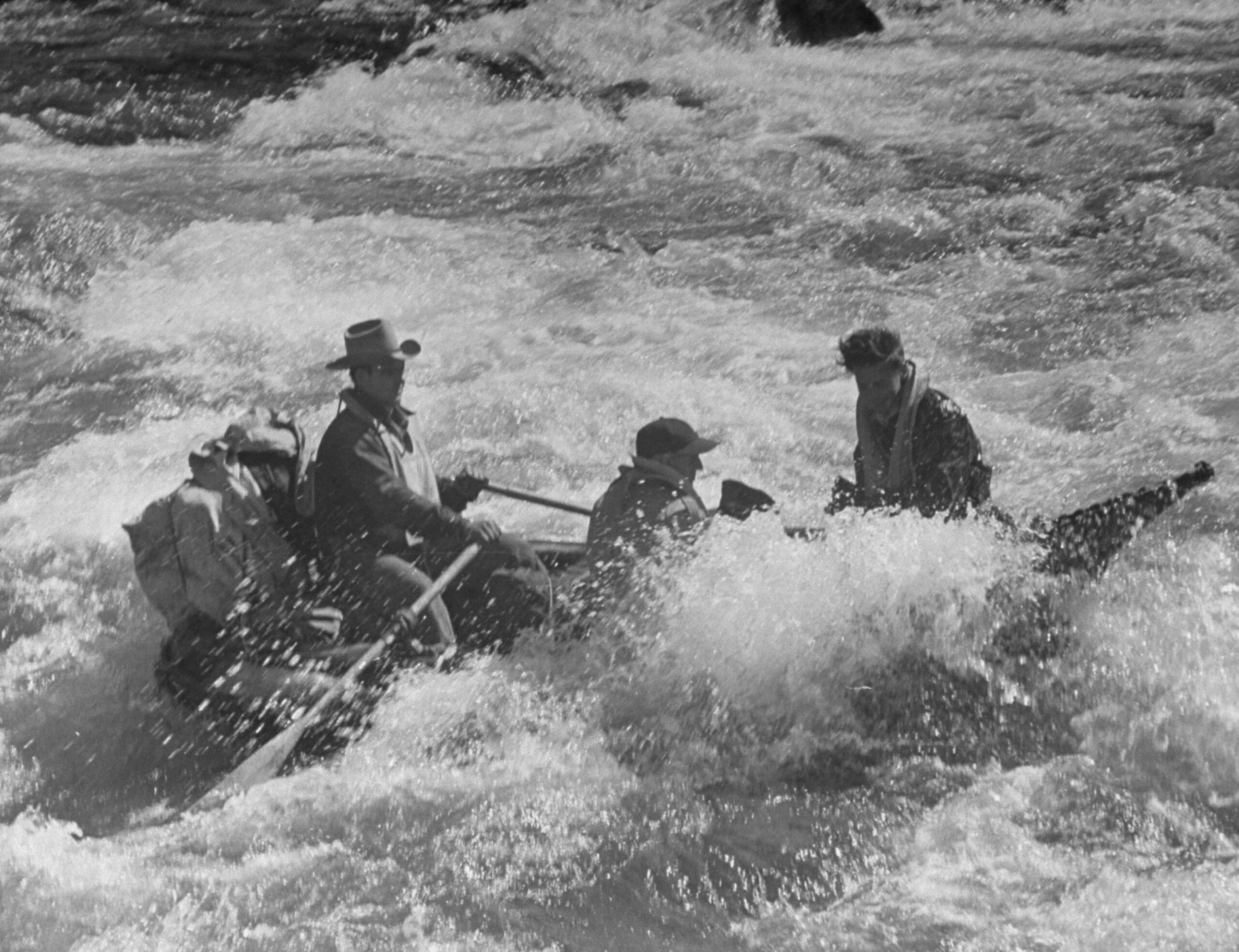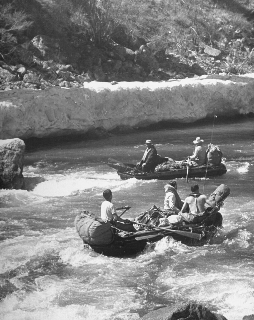 Adventurers shot the rapids on the Middle Fork of the Salmon River in Idaho, 1949.