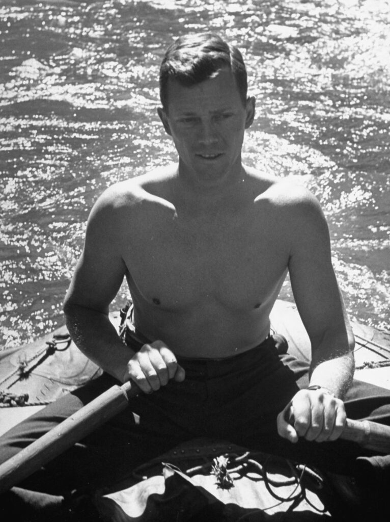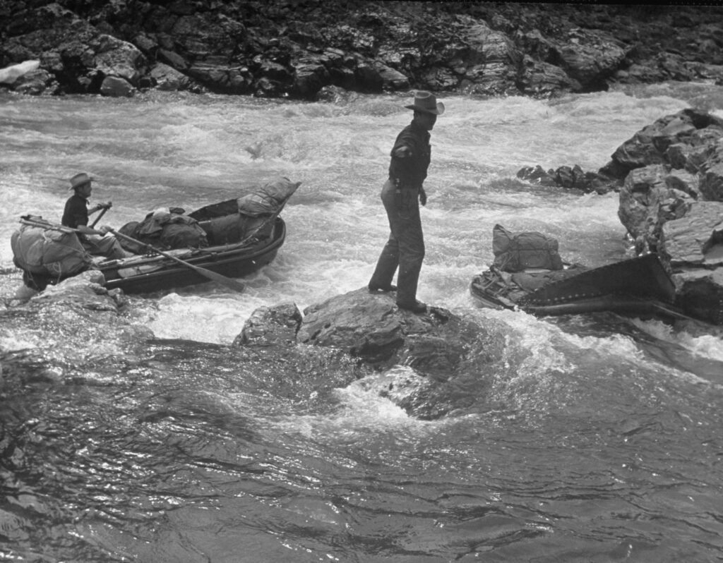Guide Hank Hastings scanned the wild rapids ahead on the Salmon River, 1949.