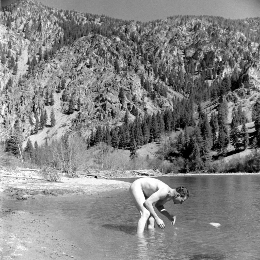 One of the trekkers took a bath in frigid waters during a nine-day adventure on the Middle Fork of the Salmon River in Idaho, 1949.