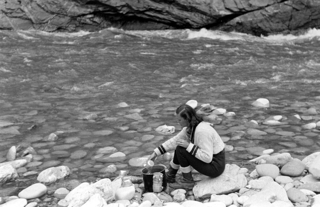 Helen Brooks washing dishes in the Salmon River, Idaho, 1949.