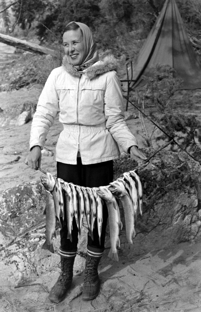 Helen Brooks held a string of trouts caught during a nine-day expedition down the Salmon River in Idaho, 1949.