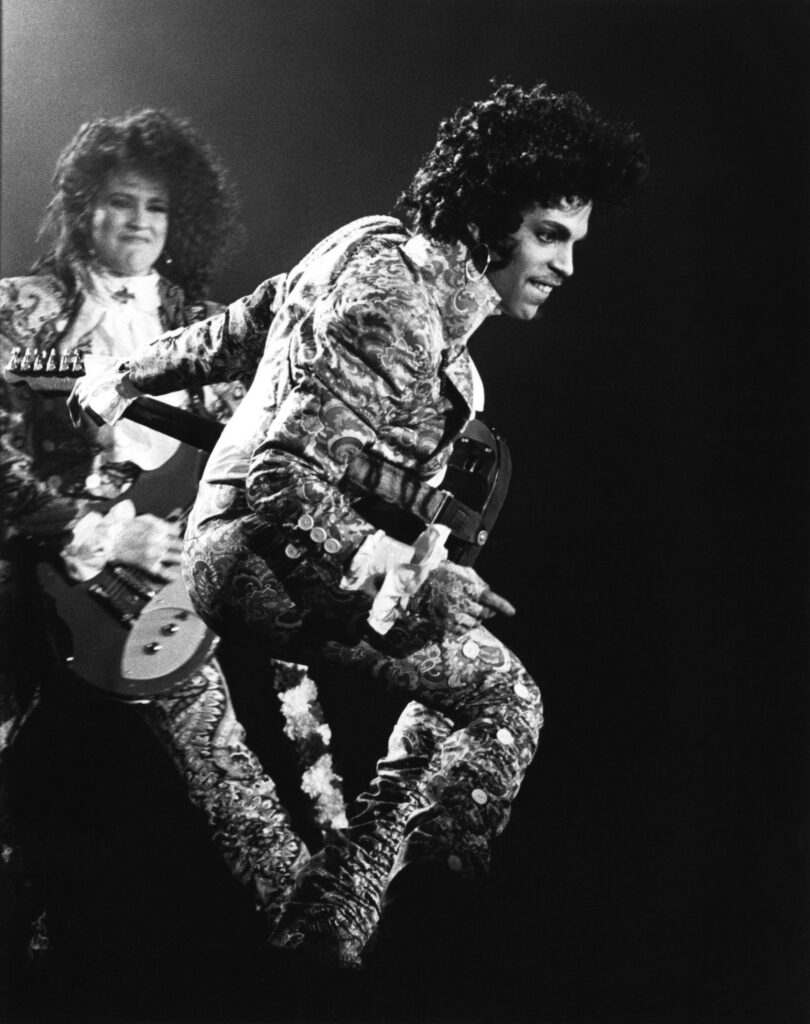 Prince, with Wendy Melvoin in the background, performed in Los Angeles, March 1985.