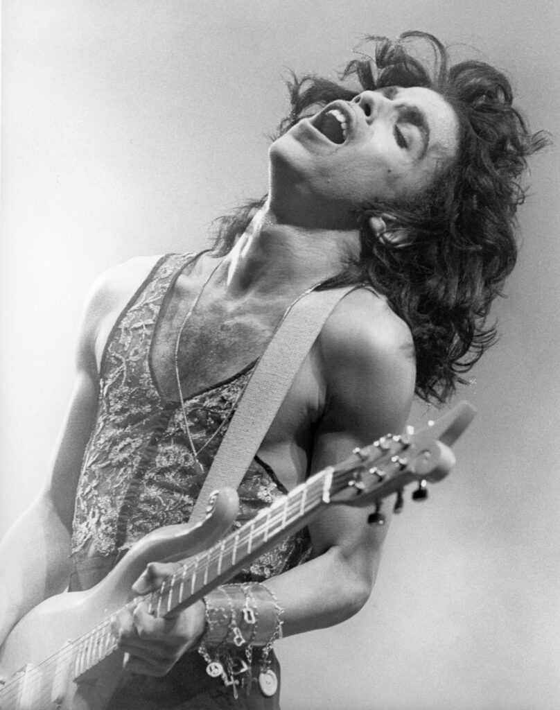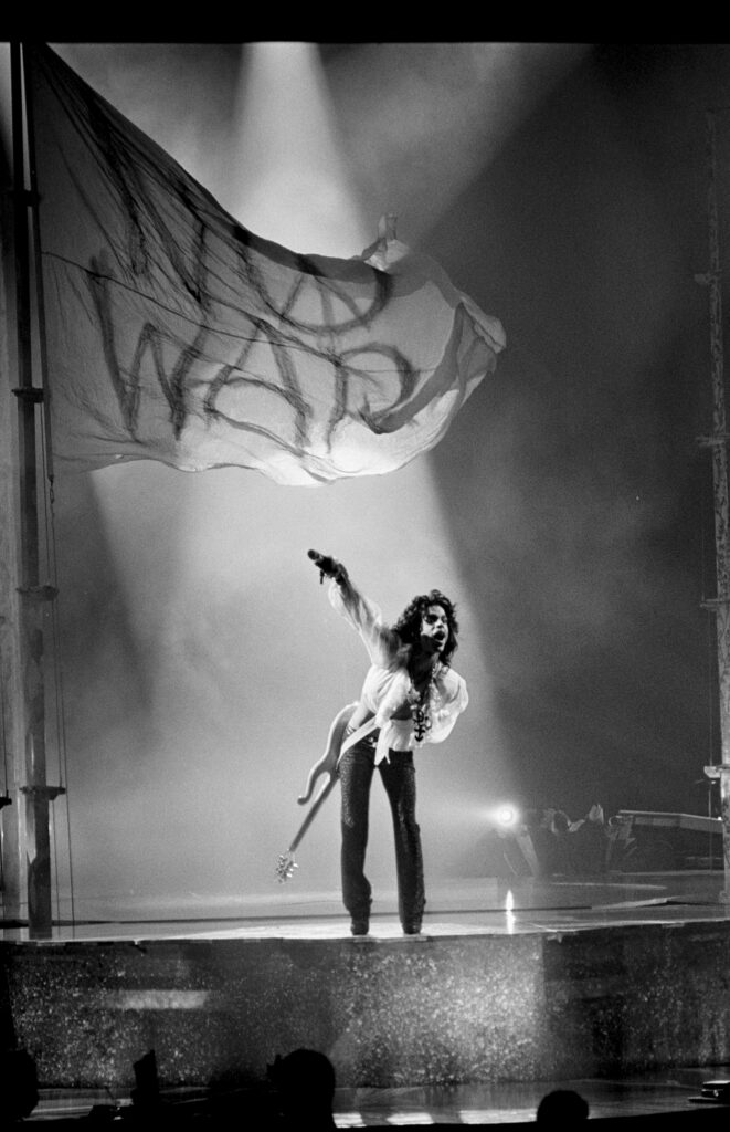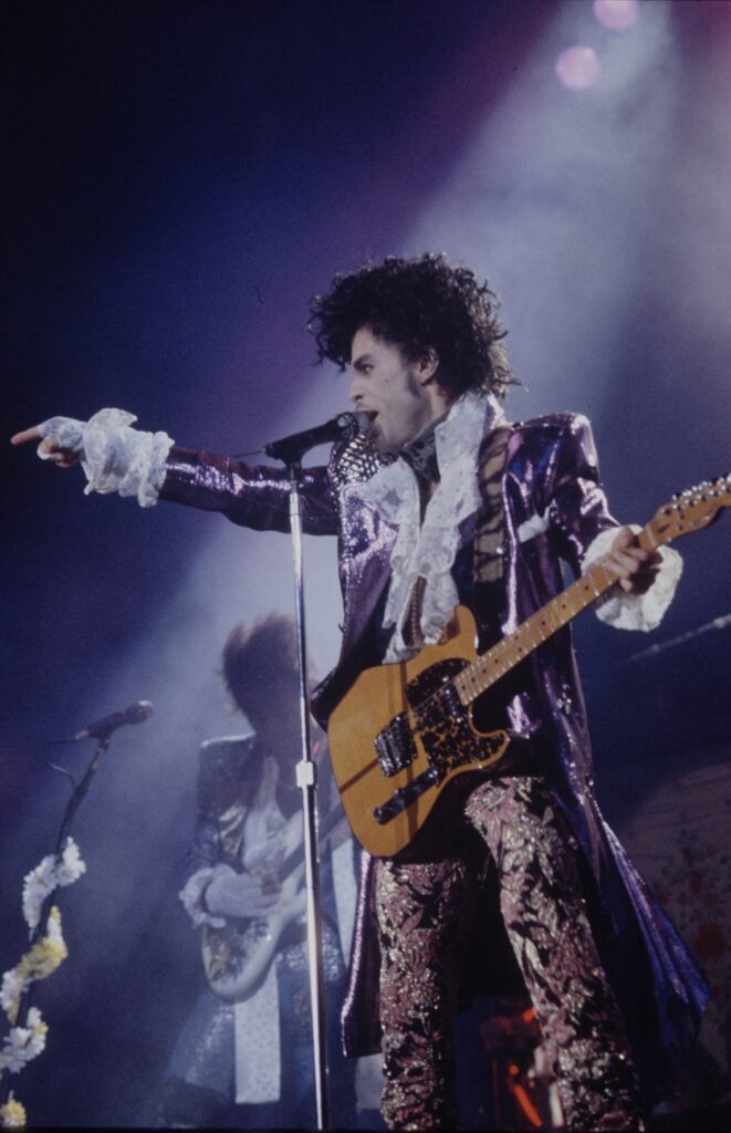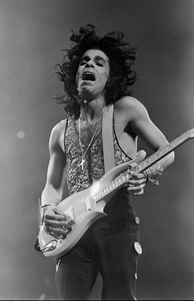 American musician Prince (1958 – 2016) plays guitar onstage during his ‘Purple Rain’ tour, Long Beach, California, March 10, 1985.