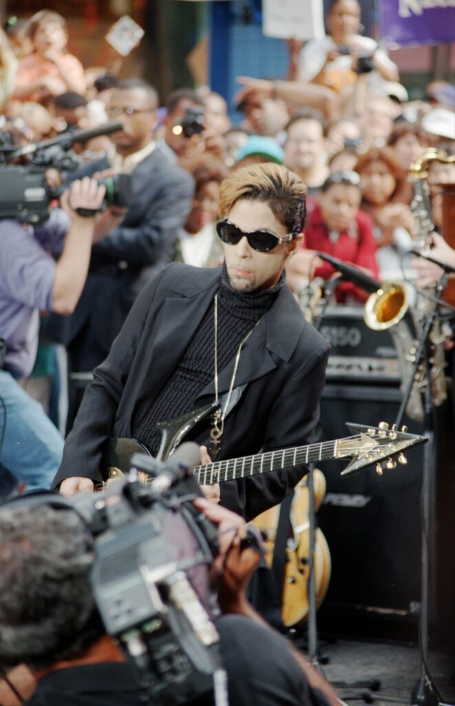 Most of the photos in this collection are of Prince working his magic on stage. But the photo at the end of this gallery shows Prince, face covered with a jacket, attempting to get away from photographers. Despite being a master of public image, he was not always ready for his closeup.
